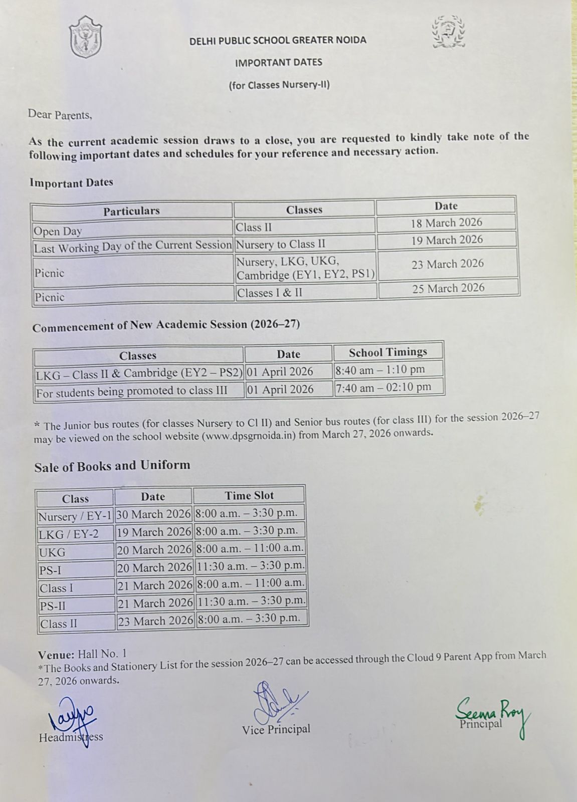Important Dates for Classes Nursery to II